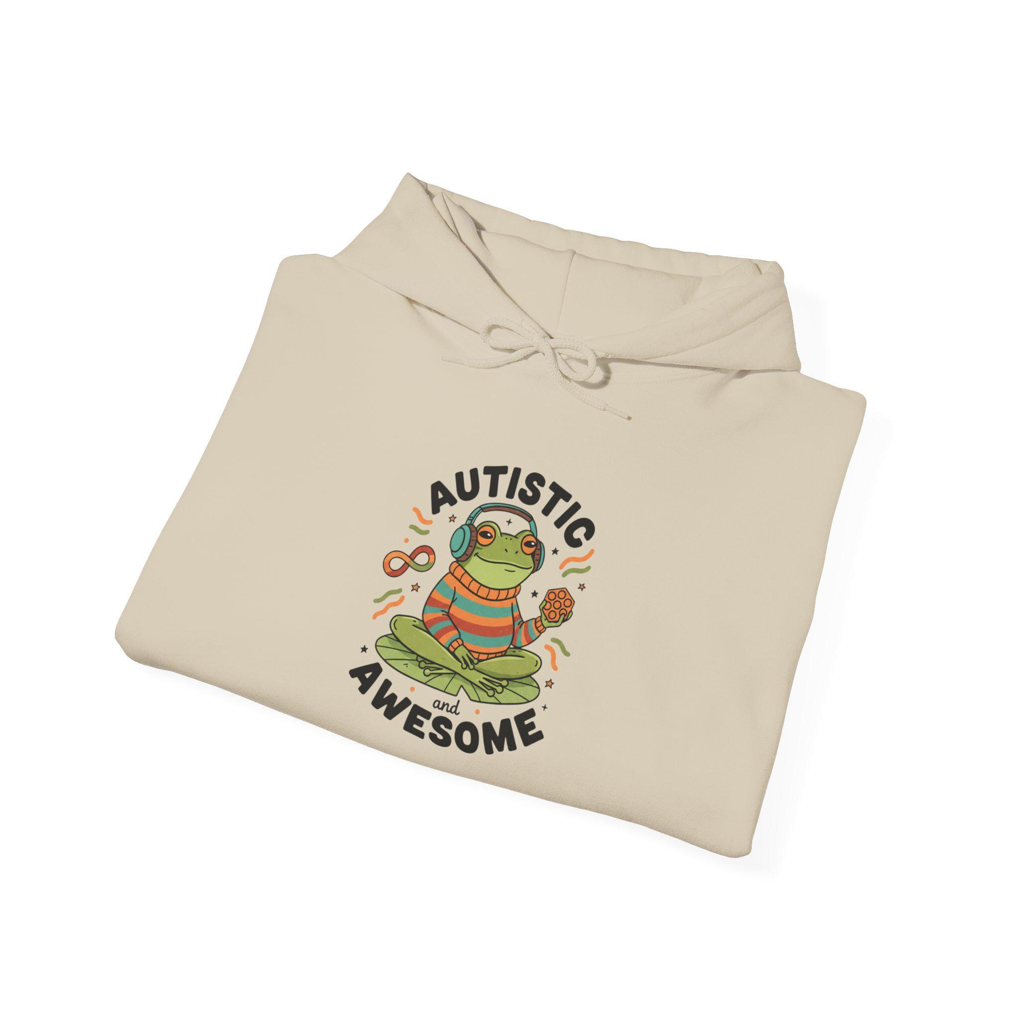 Cheeky frog illustration with handwritten retro lettering that leans into neurodiversity humor and autism-pride meme culture. The small, zine-style artwork sits on a cozy unisex hooded sweatshirt in an earthy palette with jewel-tone accents, giving the piece a homemade, outsider-art feel that reads as playful self-acceptance. Language and motifs align with autism pride and frog-meme aesthetics without referencing any protected characters or titles.