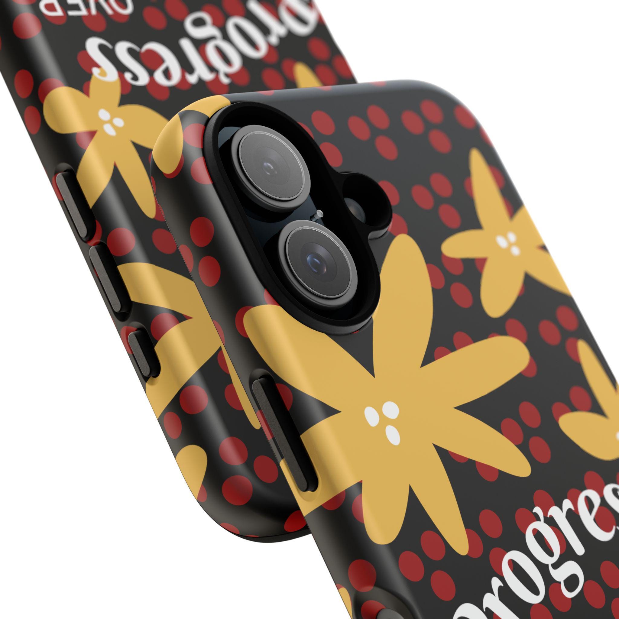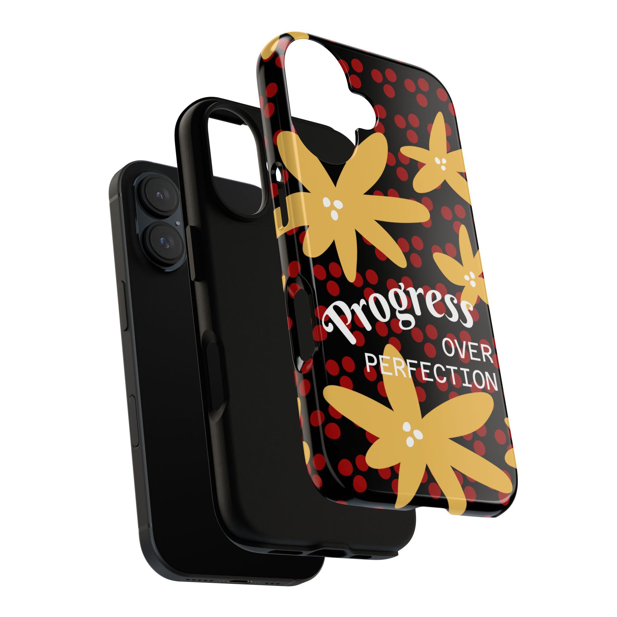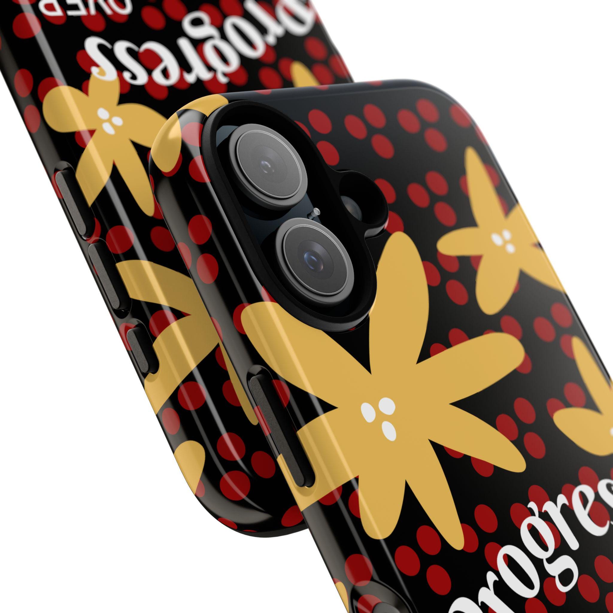 This tough phone case brings a bold, upbeat energy to daily carry. A glossy black backdrop punctuated by warm golden flowers and scattered red dots frames the uplifting message “Progress over Perfection,” turning your device into a small reminder to keep moving forward. The dual-layer construction — a rigid polycarbonate shell and a shock-absorbing TPU silicone liner — guards against drops while maintaining a slim profile. UV-resistant inks keep colors vivid through everyday wear, and precise cutouts preserve easy access to ports and wireless charging. It’s a protective, wearable affirmation that fits into a life of busy creativity and focused hustle.