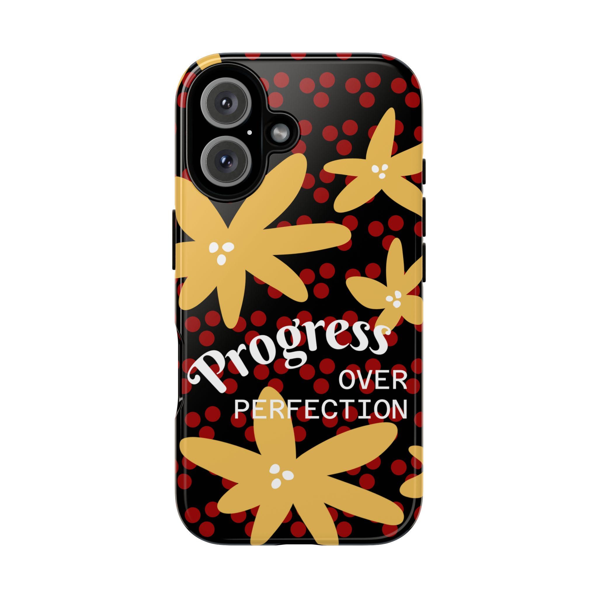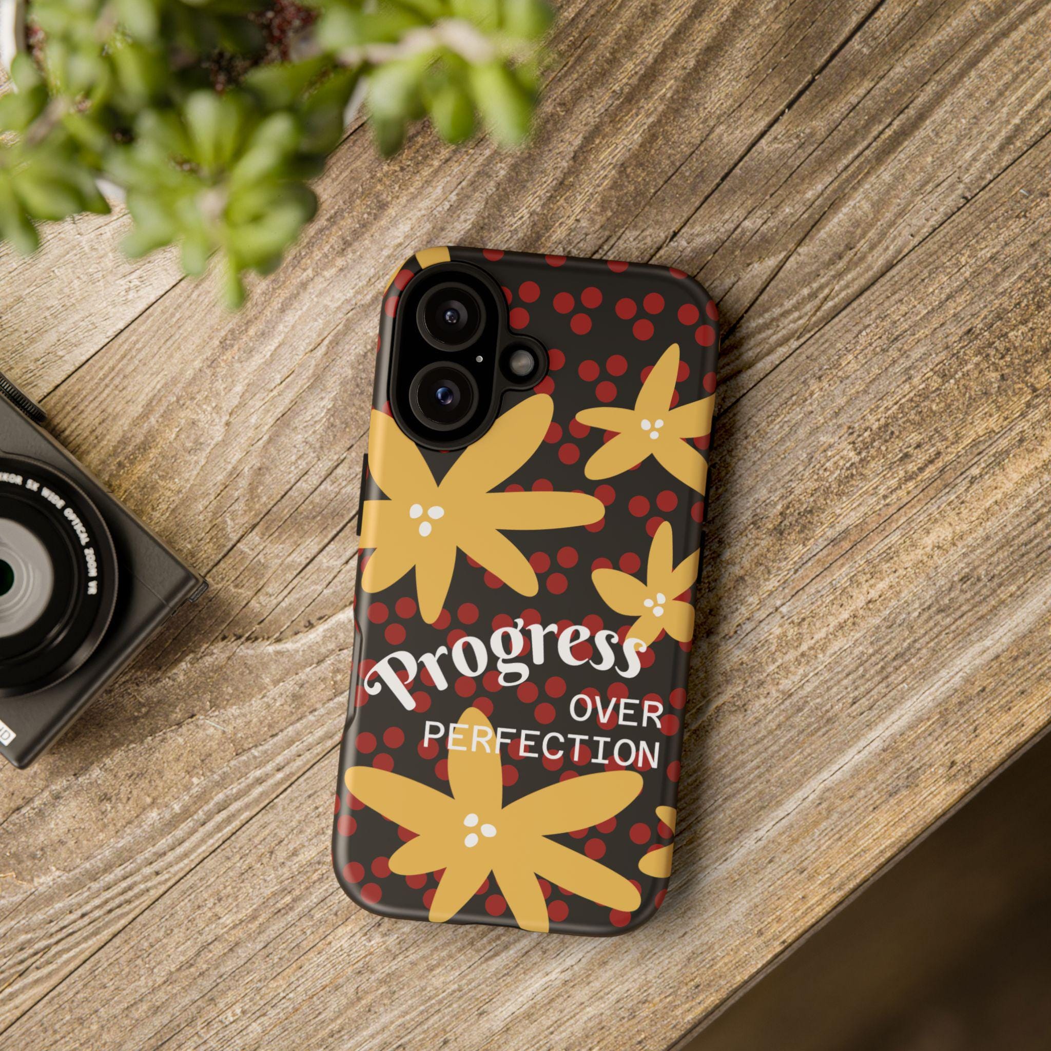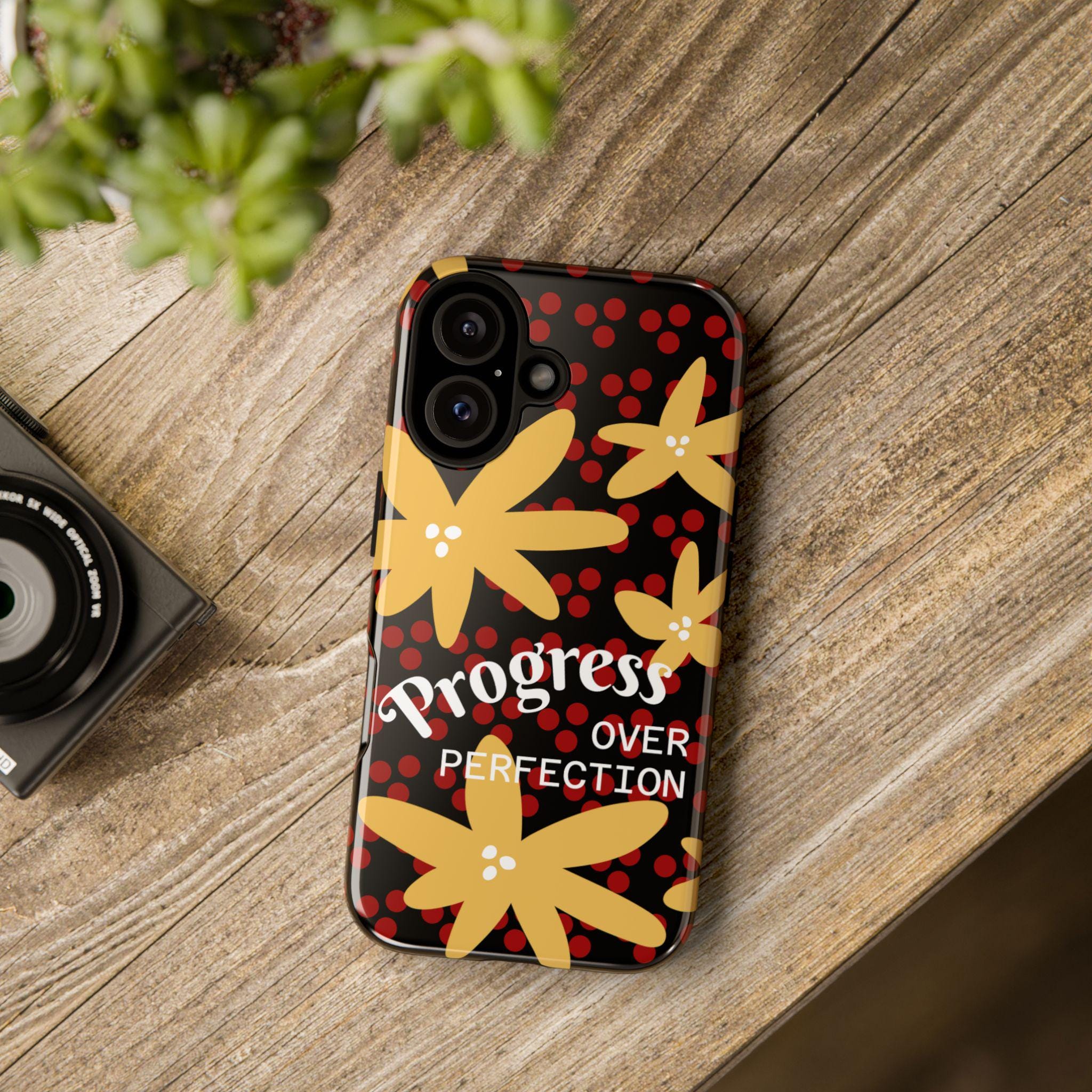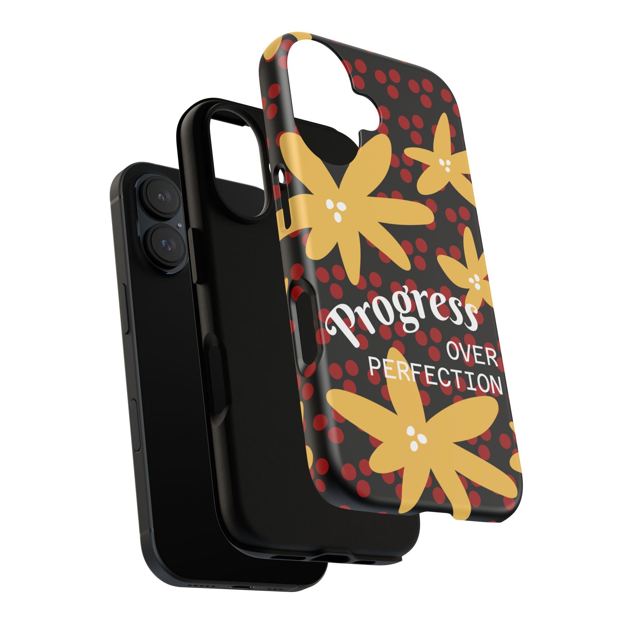 This tough phone case brings a bold, upbeat energy to daily carry. A glossy black backdrop punctuated by warm golden flowers and scattered red dots frames the uplifting message “Progress over Perfection,” turning your device into a small reminder to keep moving forward. The dual-layer construction — a rigid polycarbonate shell and a shock-absorbing TPU silicone liner — guards against drops while maintaining a slim profile. UV-resistant inks keep colors vivid through everyday wear, and precise cutouts preserve easy access to ports and wireless charging. It’s a protective, wearable affirmation that fits into a life of busy creativity and focused hustle.