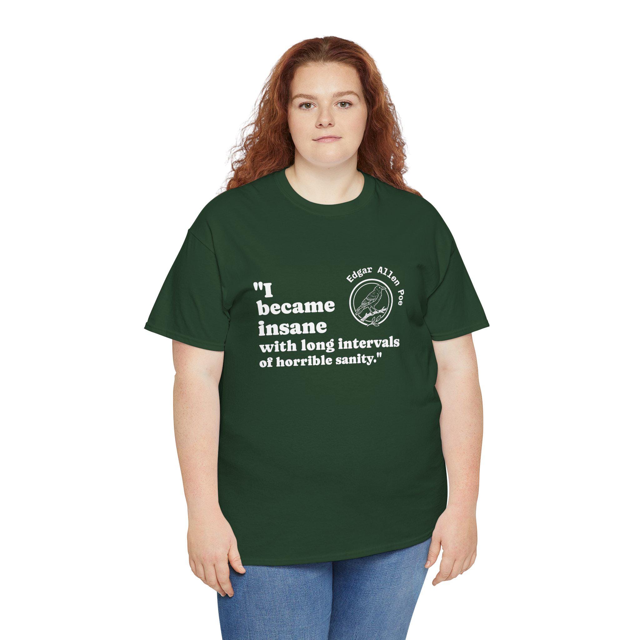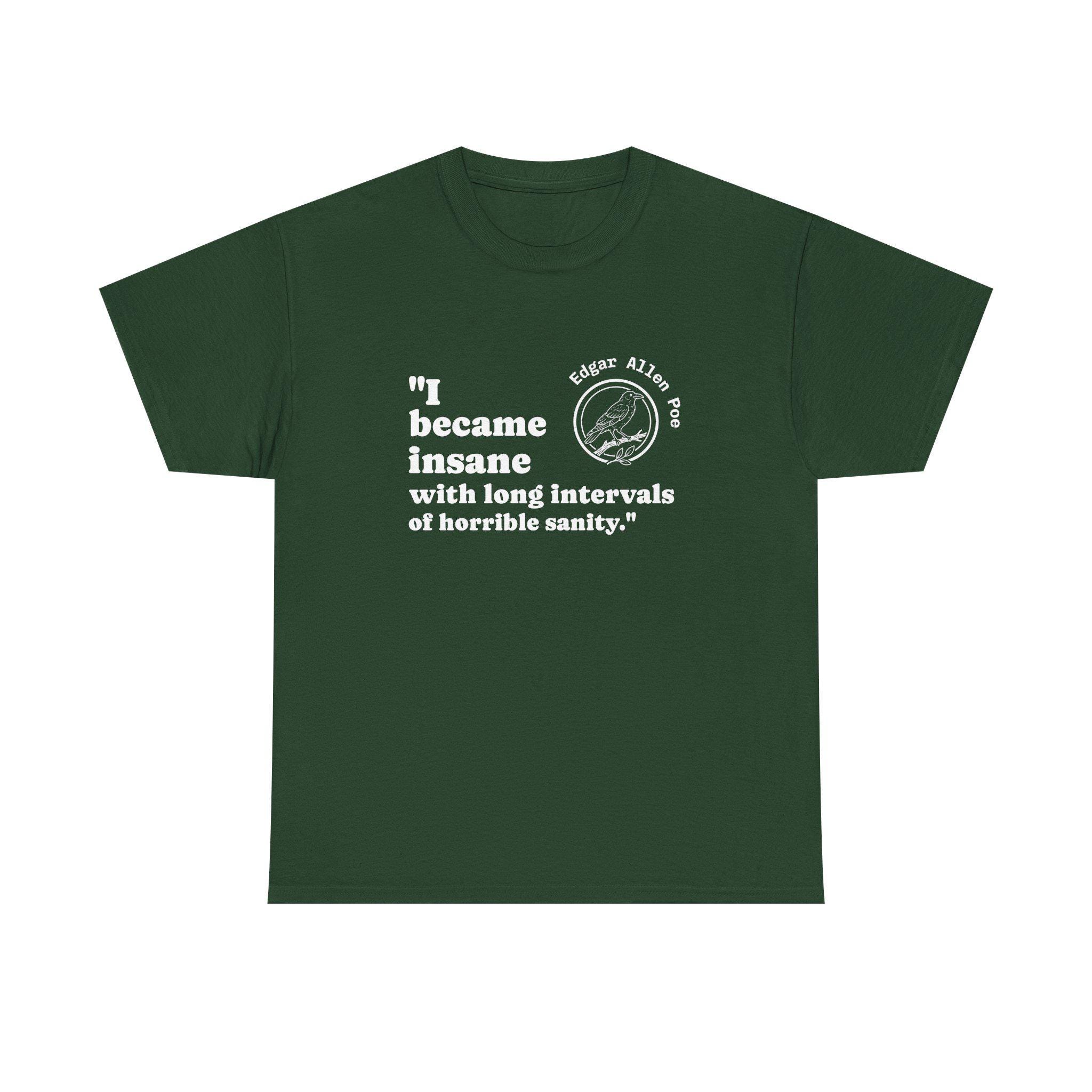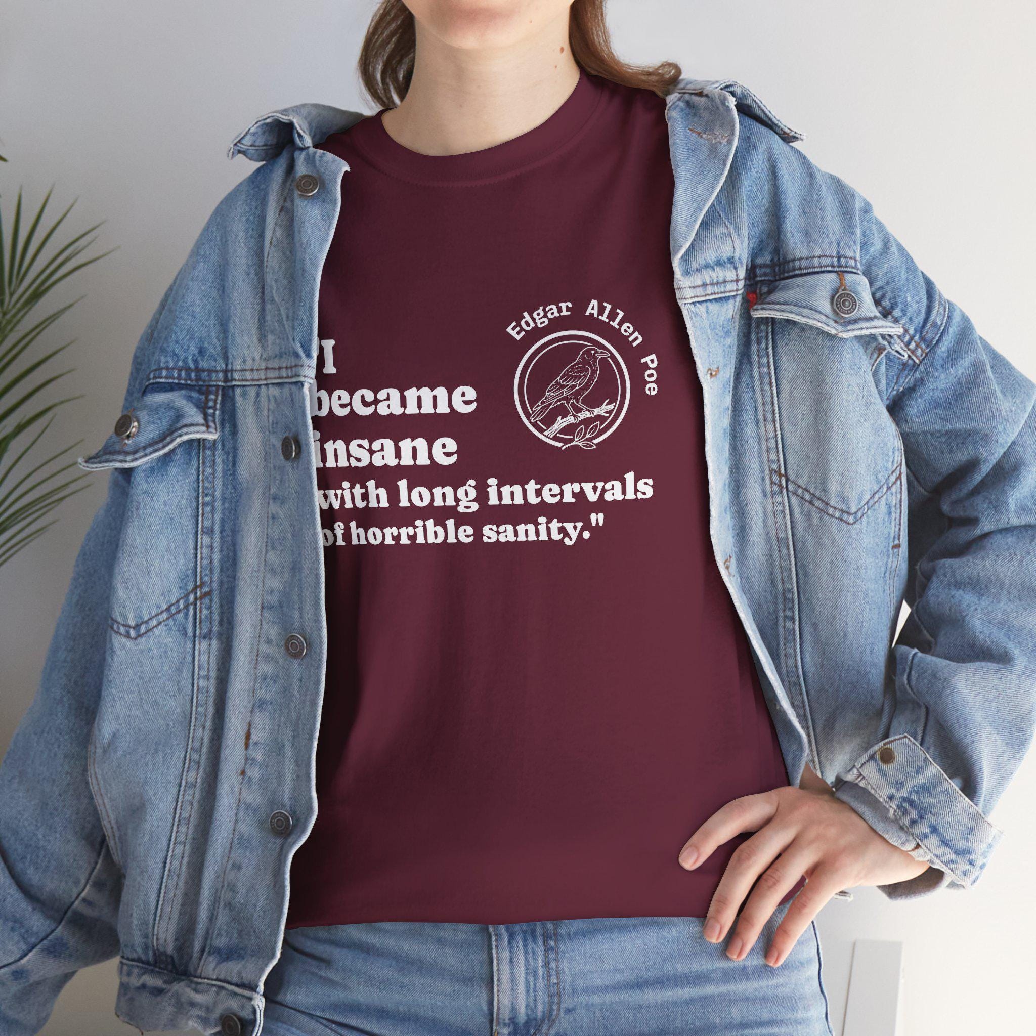 A soft, sturdy tee that wears like a well-read manifesto. This classic crew shirt carries a bold, witty front print—a short quote paired with a stamped circular emblem of a raven—placed slightly left of center for a casual, lived-in look. The medium-weight cotton holds shape and ink with age, so the message stays crisp through washes. It sits relaxed at the shoulders and chest, letting you layer a flannel or wear it solo while keeping a neat neckline thanks to the ribbed collar. Simple, durable, and quietly irreverent—made to be worn by someone who prefers statements over slogans and comfort over fuss.