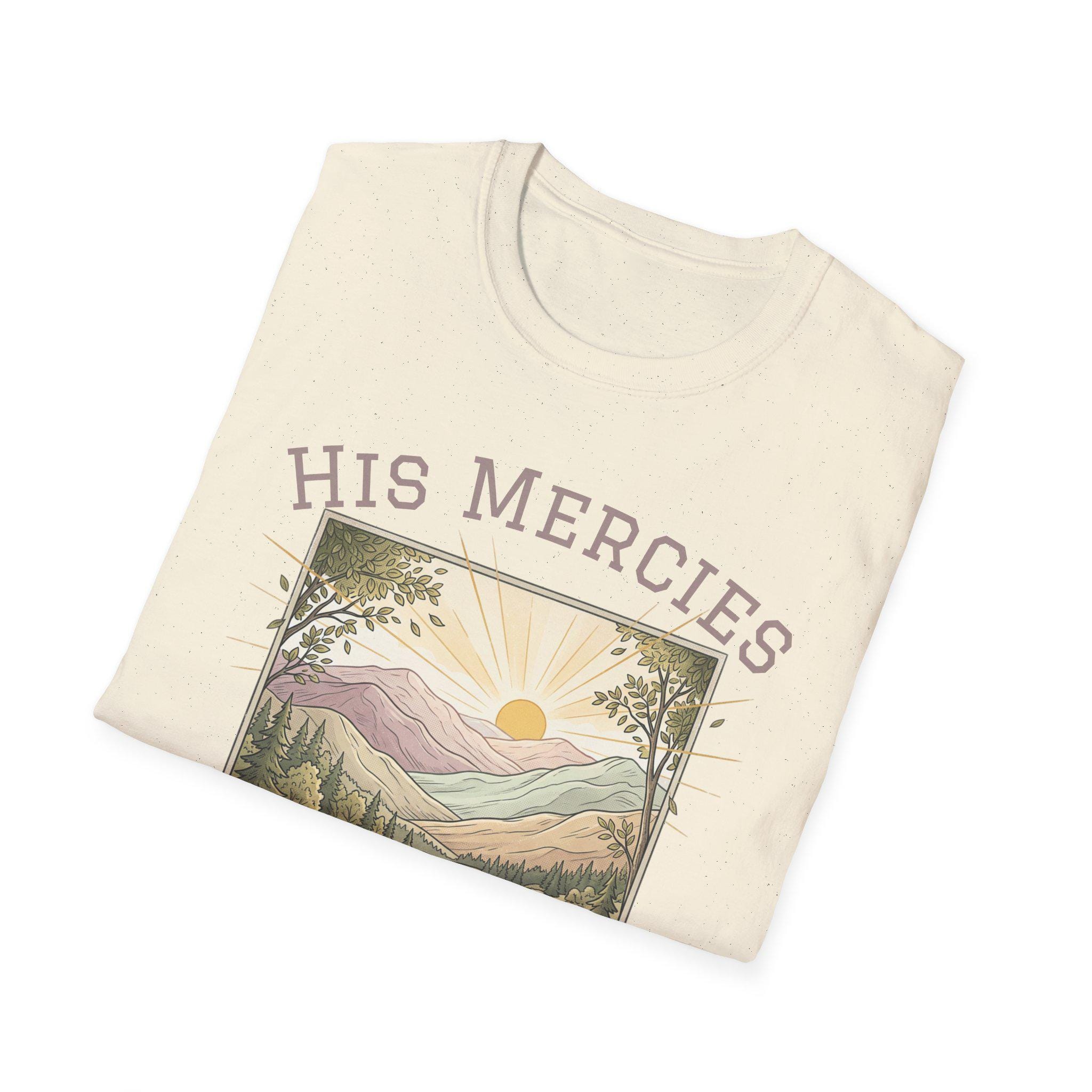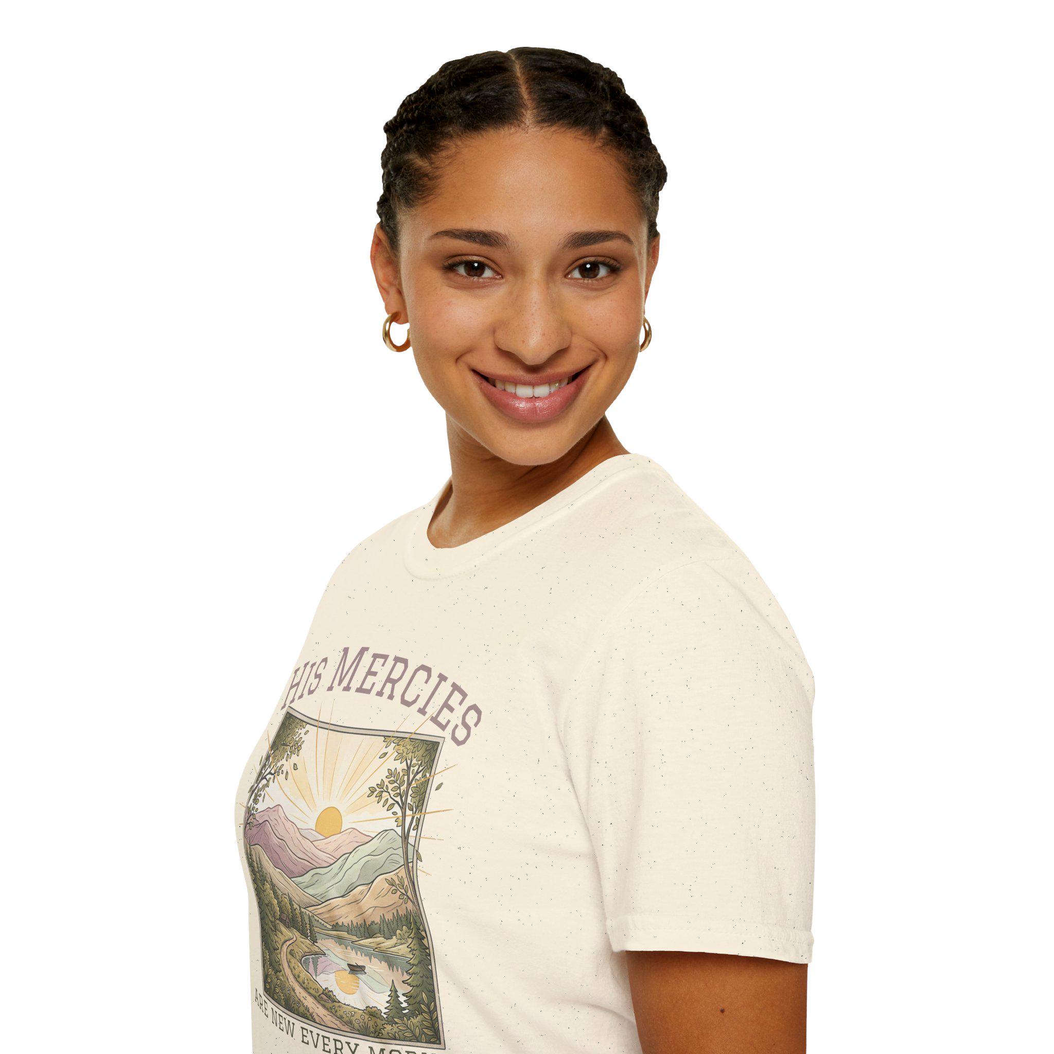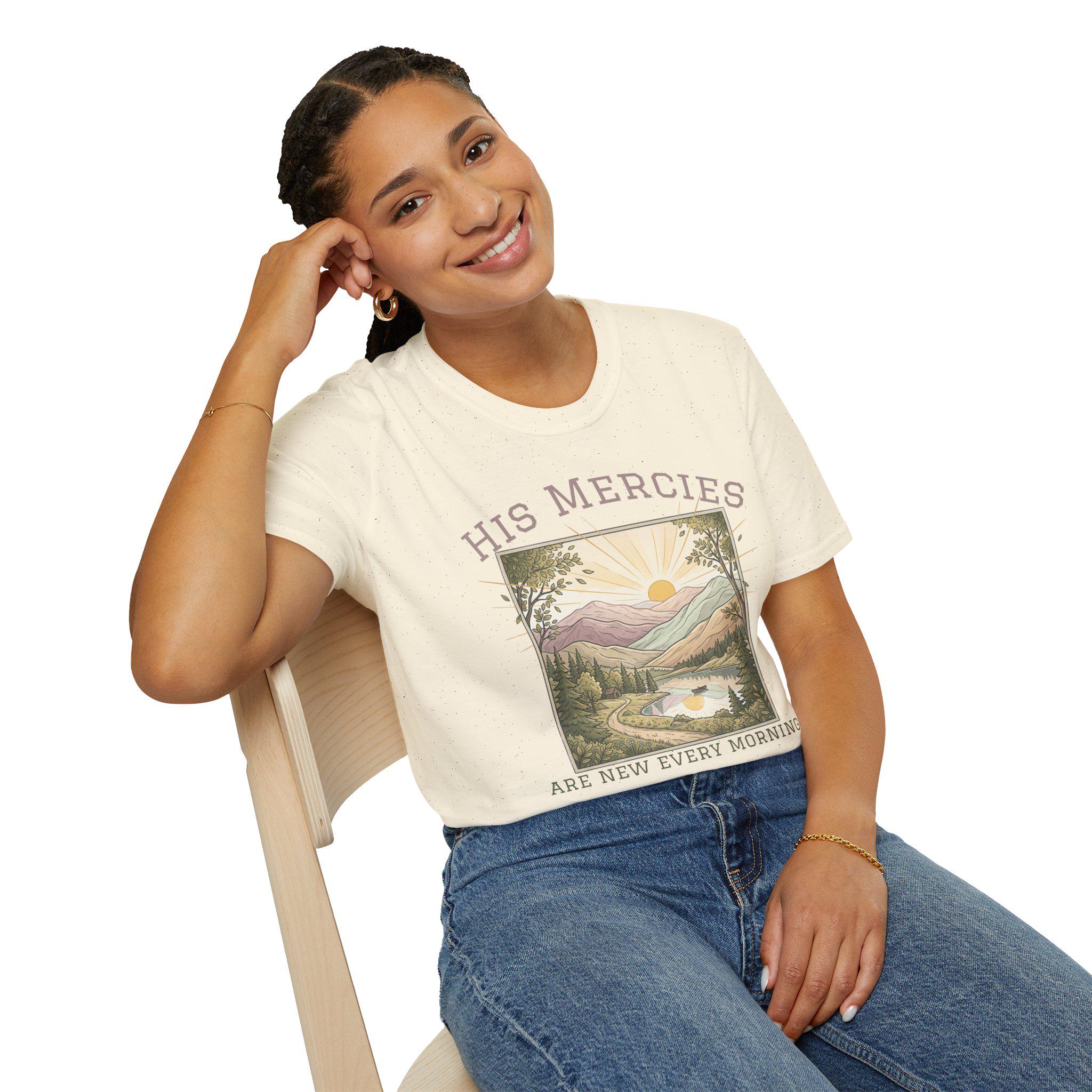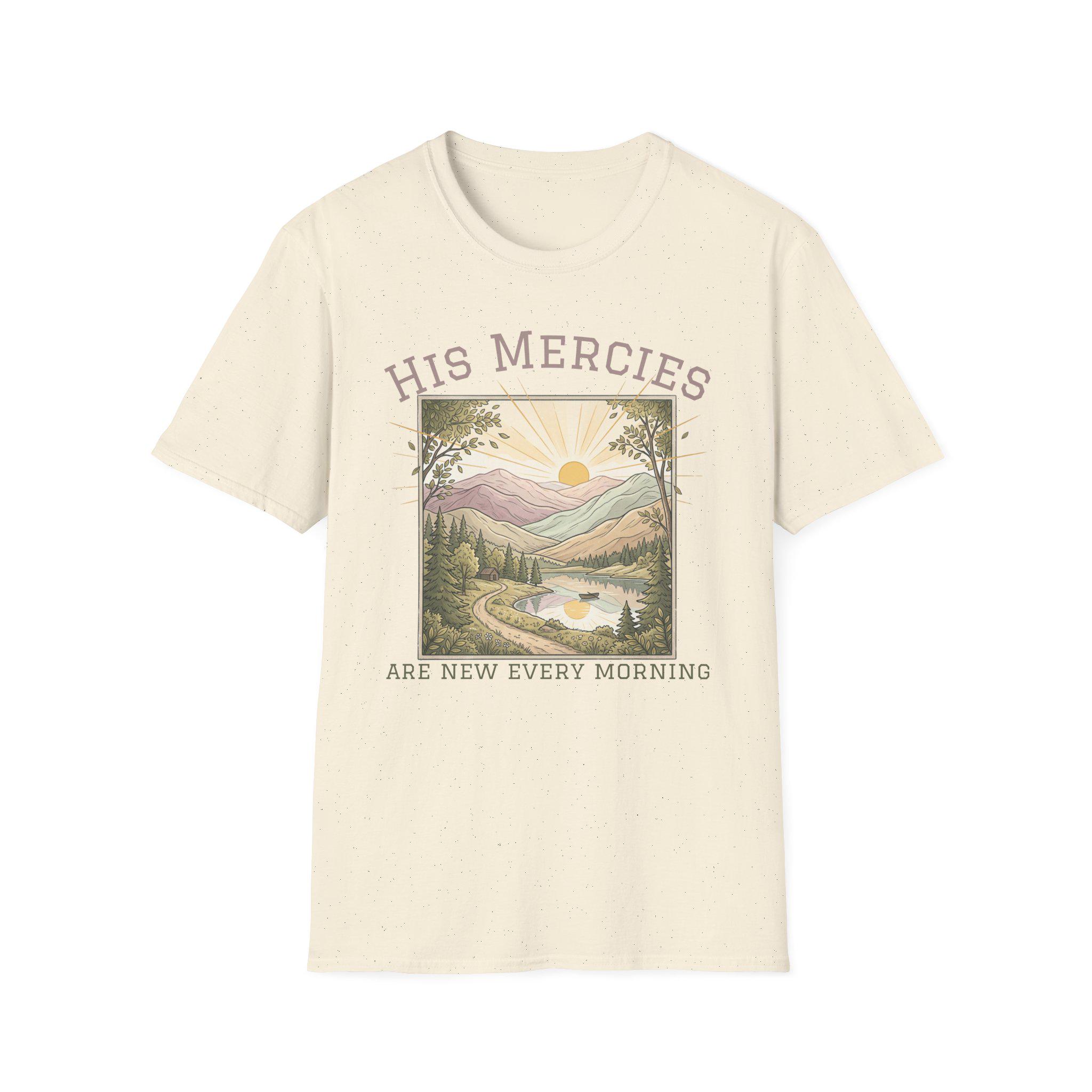 A softly worn tee that reads like a quiet prayer at dawn. This lightweight cotton shirt carries a vintage-style landscape — sun rising over purple mountains, a calm river, and whispering pines — framed beneath the words “His mercies are new every morning.” The neutral, speckled Natural fabric gives the art an heirloom feel, while the classic crew cut and clean lines keep the look simple and sincere. Wear it to slow mornings, small group meetups, or when you want to carry a gentle reminder of hope with you through the day.