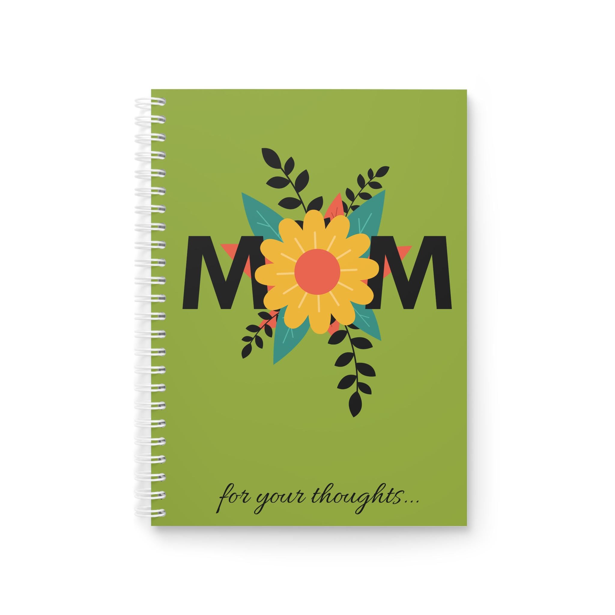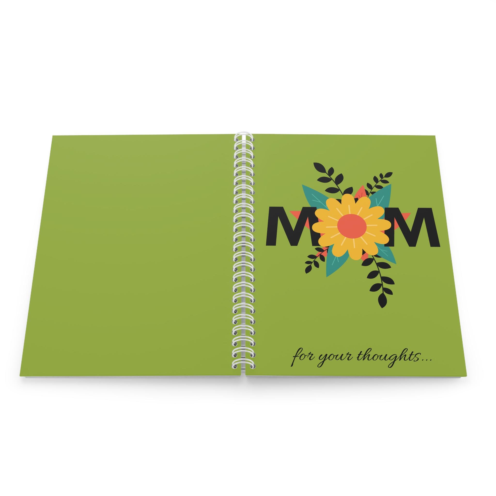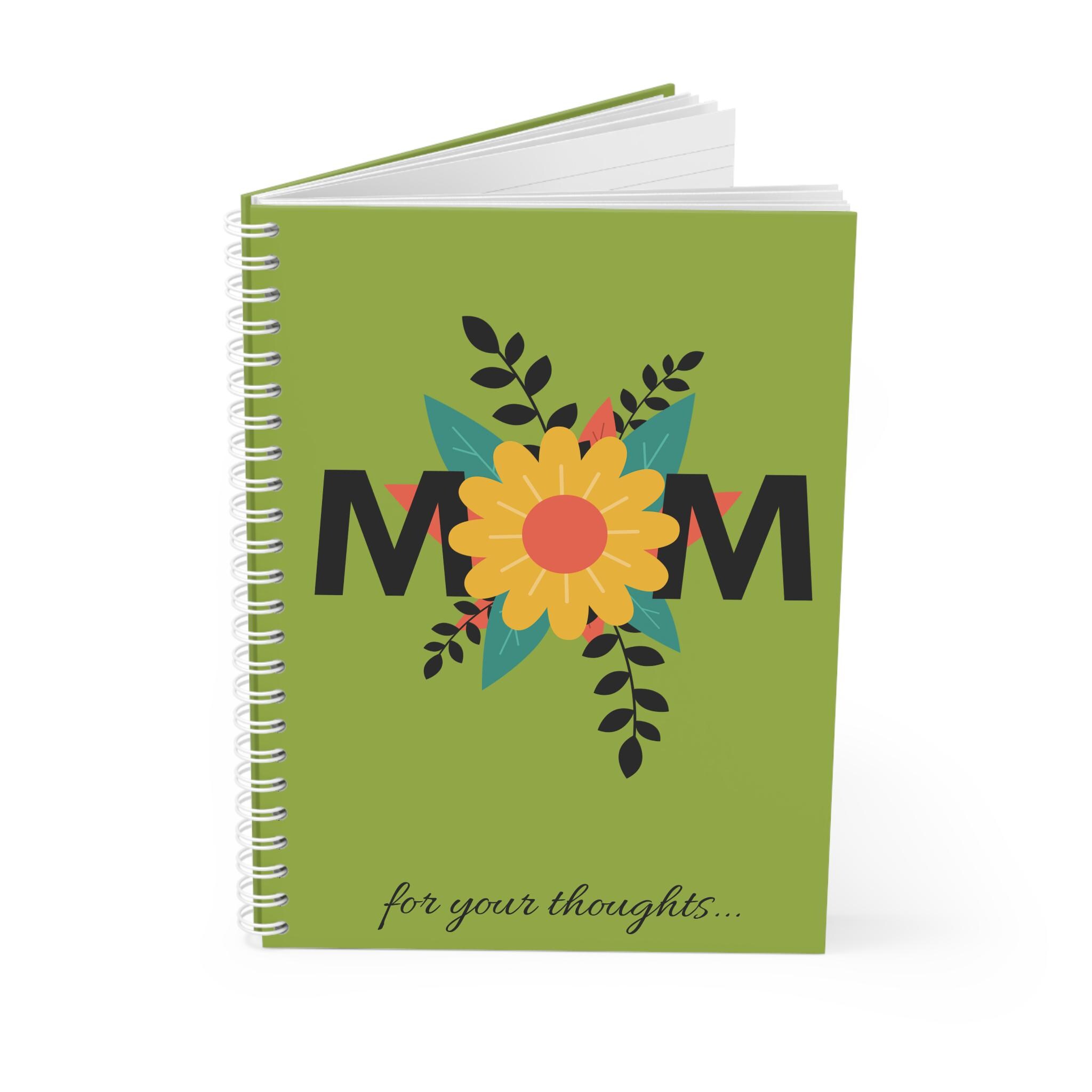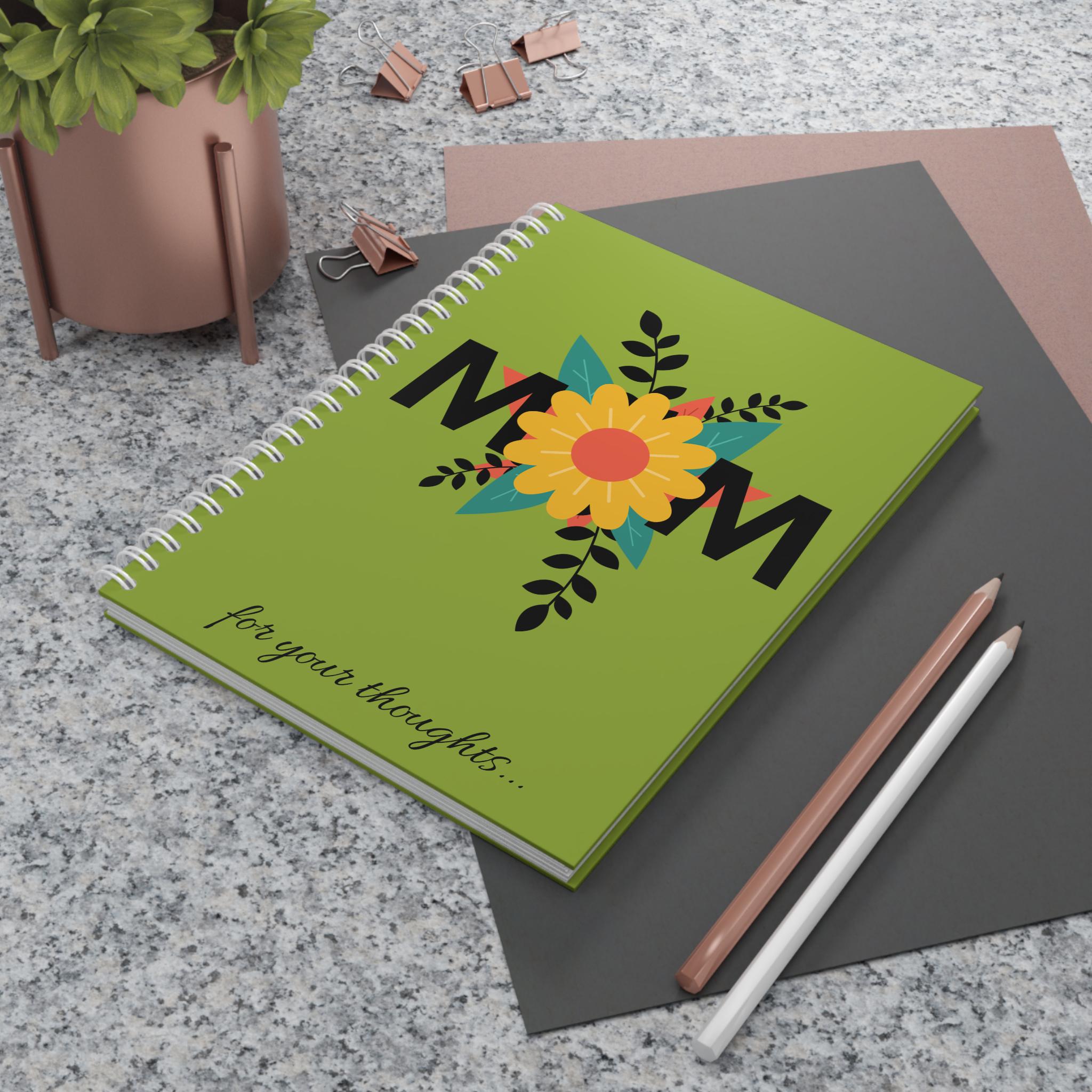 A cheerful, spiral-bound notebook designed to celebrate mom with a bright floral motif. The semi-gloss cover shows a bold sunflower nestled between the letters “MOM,” set against a fresh green background and finished with a cursive “for your thoughts…” along the bottom. Inside, 128 ruled pages of smooth 90gsm paper invite lists, memories, and daily notes. The white metal spiral lets pages lie flat or be removed cleanly, while vibrant, edge-to-edge printing keeps the colors lively on both front and back covers. This notebook slips easily into a tote or bedside stack and brings a sunny, personal touch to everyday writing.