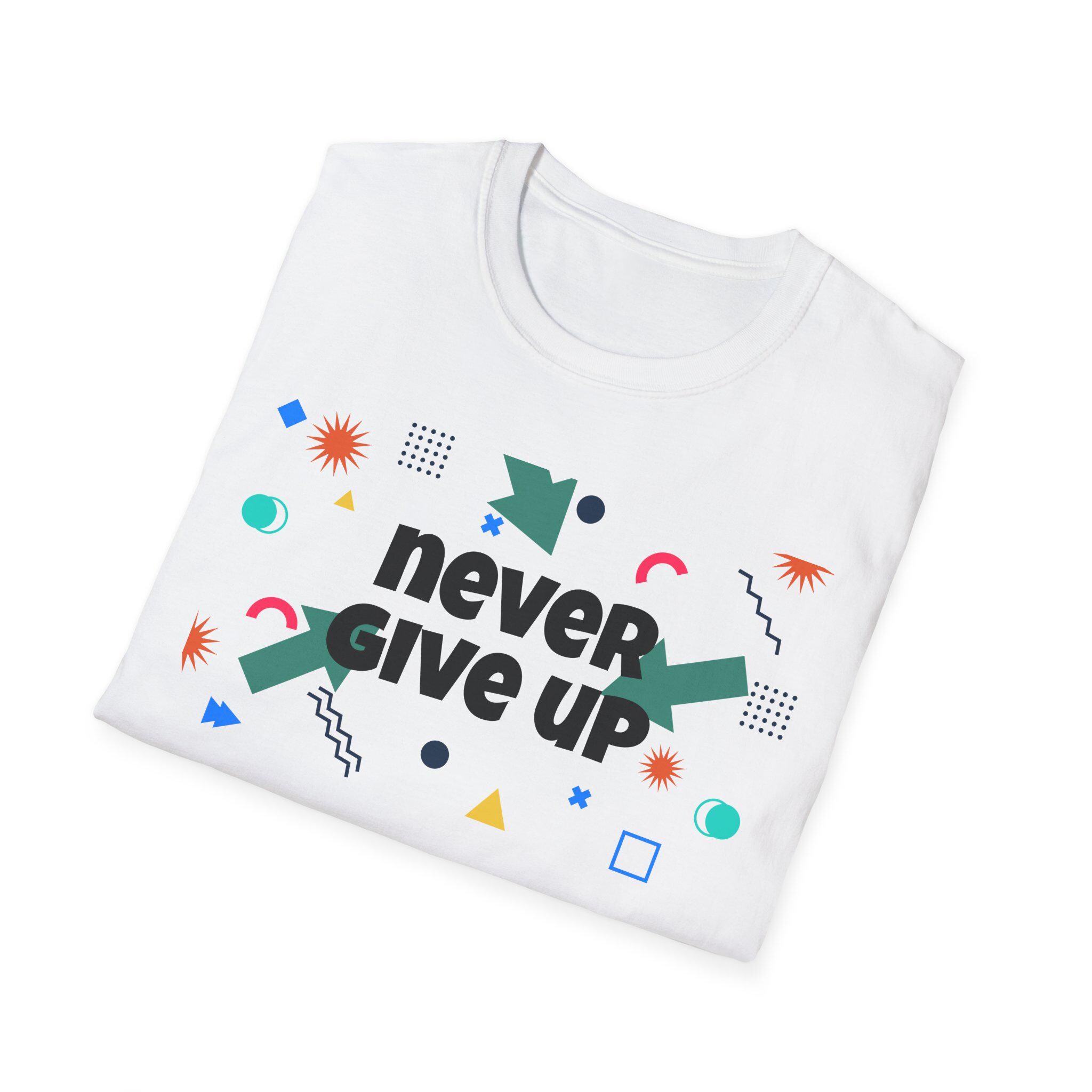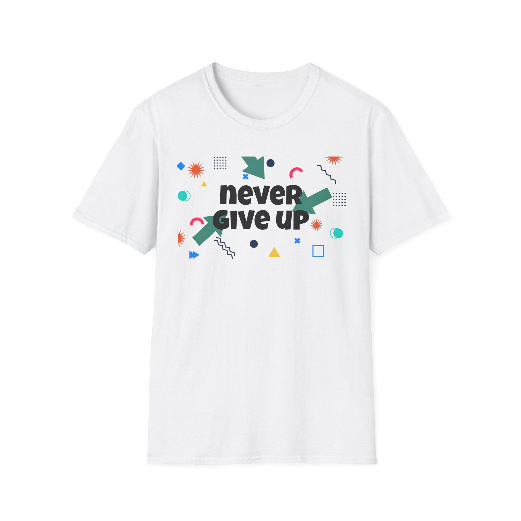 Lightweight, soft, and boldly optimistic — this crewneck tee carries a playful, modern design that says “never give up” without shouting. The smooth, ring-spun cotton feels gentle on the skin and drapes cleanly, while the tubular knit and ribbed collar keep the silhouette tidy through many wears. Bright geometric accents around the slogan give the shirt a spirited, retro-meets-contemporary look that works whether you’re heading to a casual meet-up, a volunteer event, or a creative workshop. Wear it when you want quiet confidence, a reminder to keep going, and a splash of color that lifts the day.