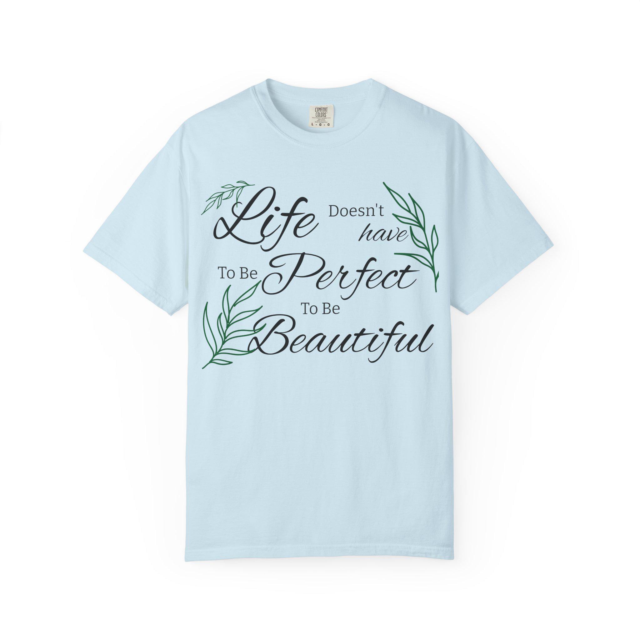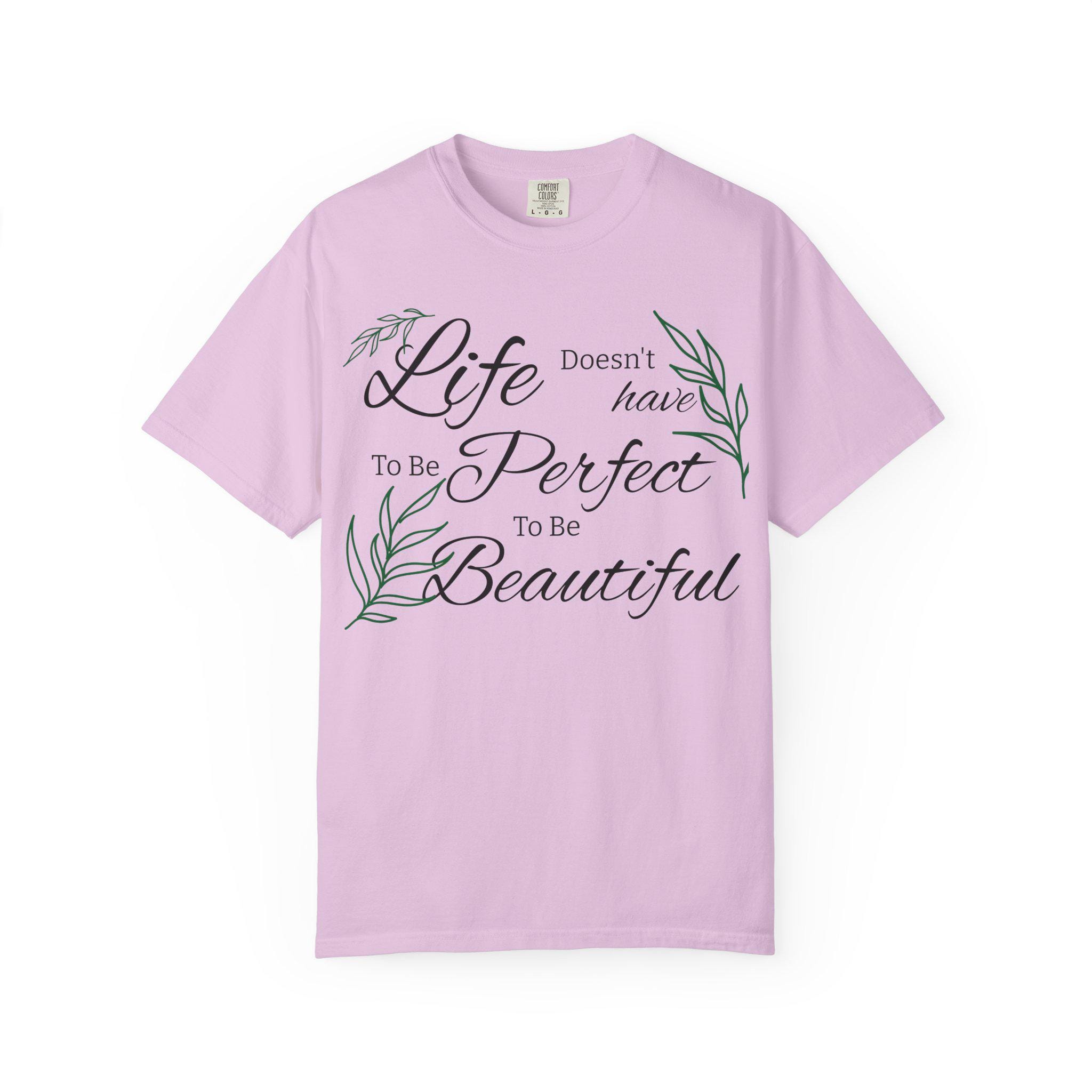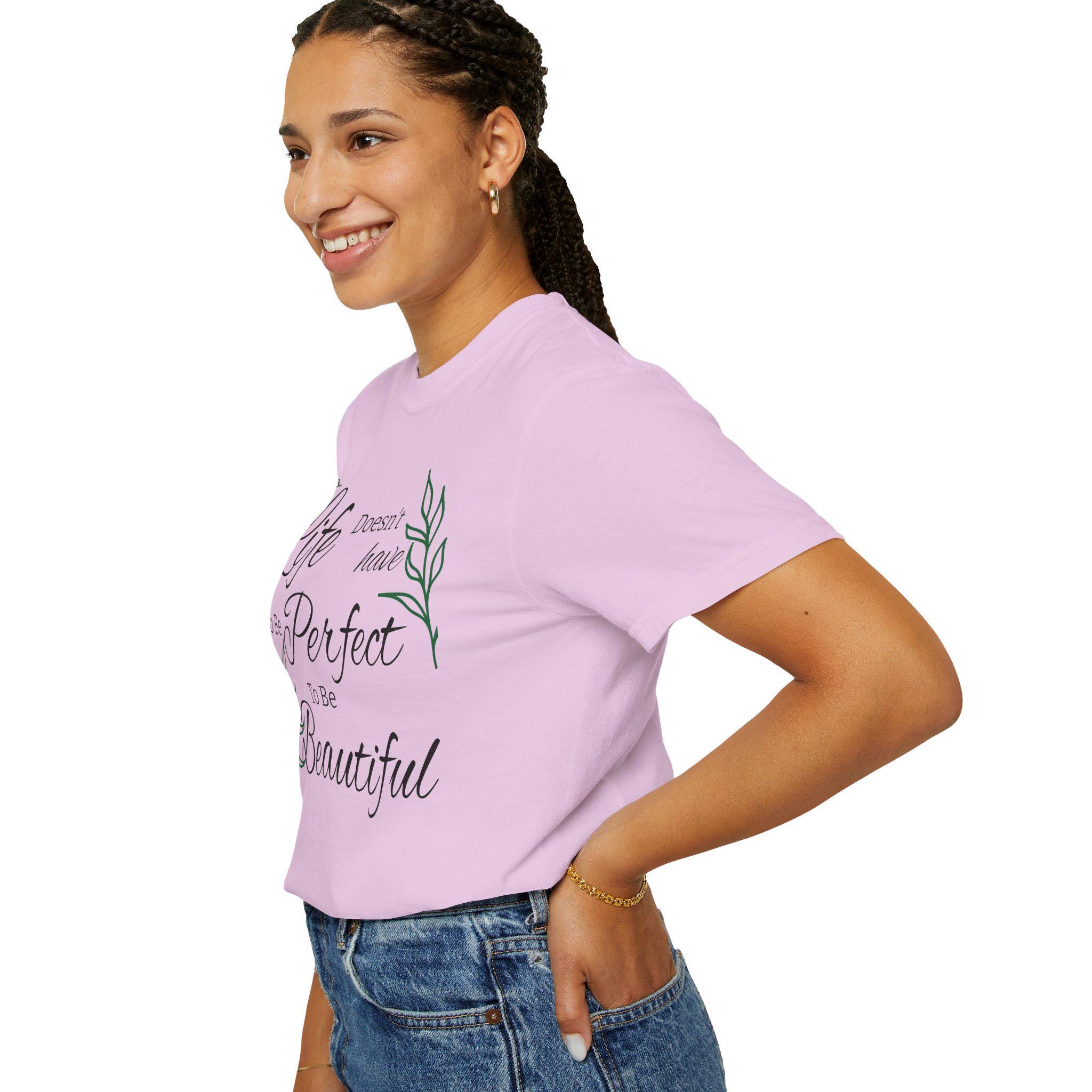 Soft, lived-in cotton meets quiet encouragement. This relaxed-fit tee wears like an old favorite the moment you pull it on — the garment-dyed finish gives a gentle, muted color and a pillowy hand while the script and delicate leaf illustrations whisper a simple message: life doesn’t have to be perfect to be beautiful. It’s the kind of shirt you reach for on slow mornings, for backyard coffee, or to layer under a cardigan at a casual gathering. Durable double-needle stitching and a heavyweight knit mean it holds its shape and stays comfortable through repeated wear. Available in a wide range of tones and sizes, it blends into everyday routines and becomes part of the small rituals that brighten ordinary days.