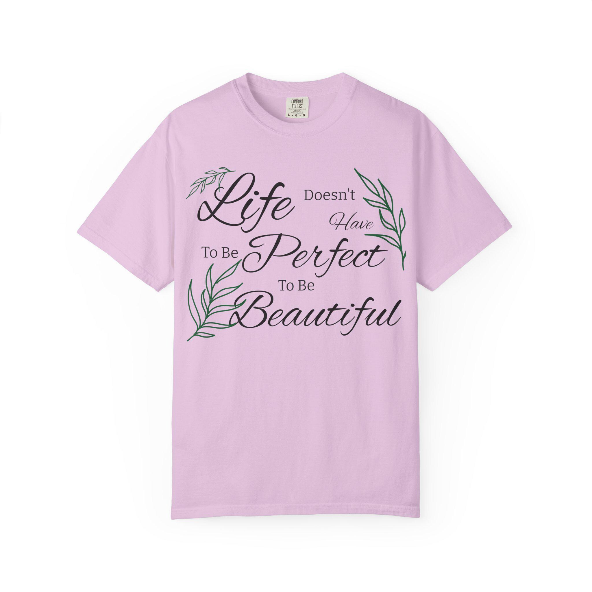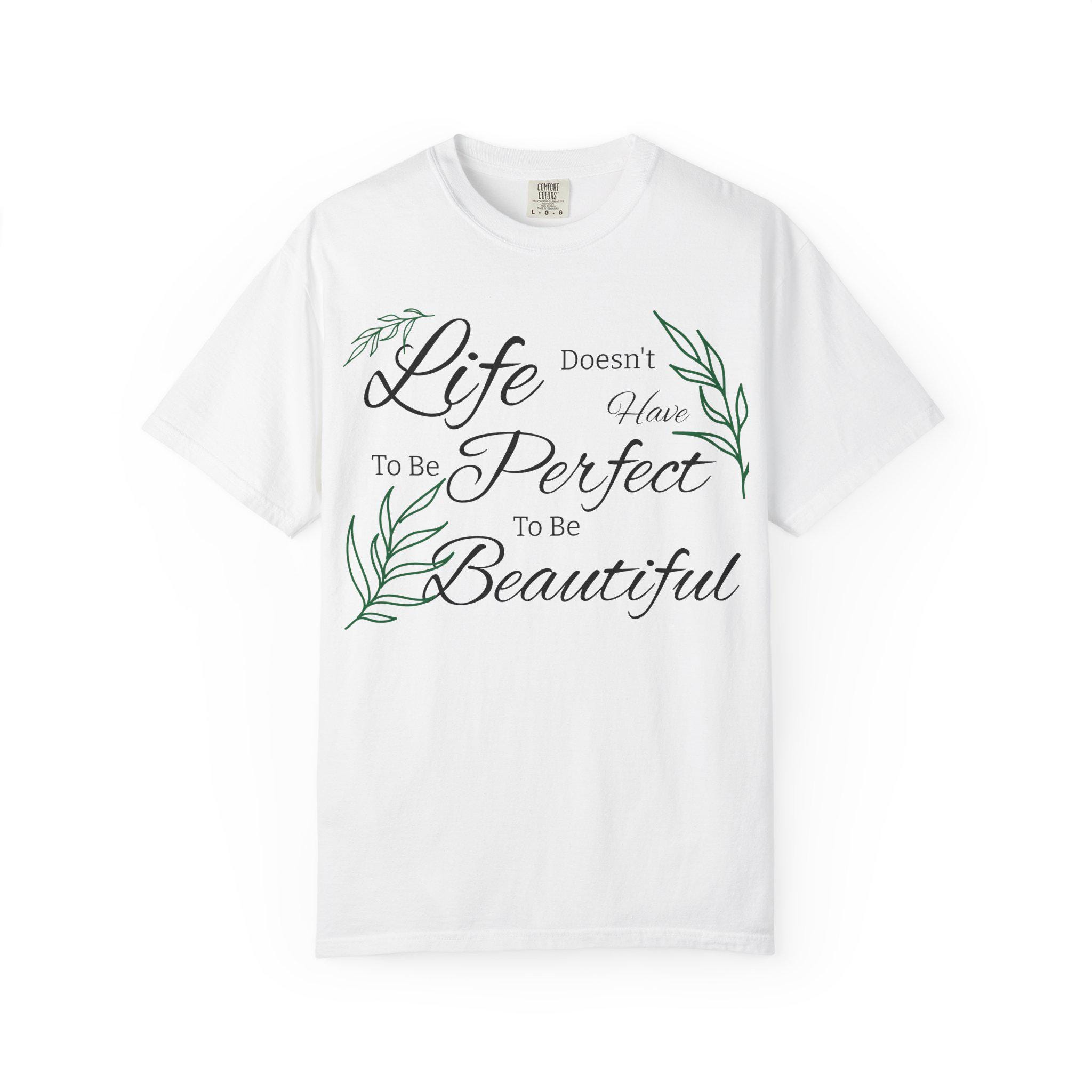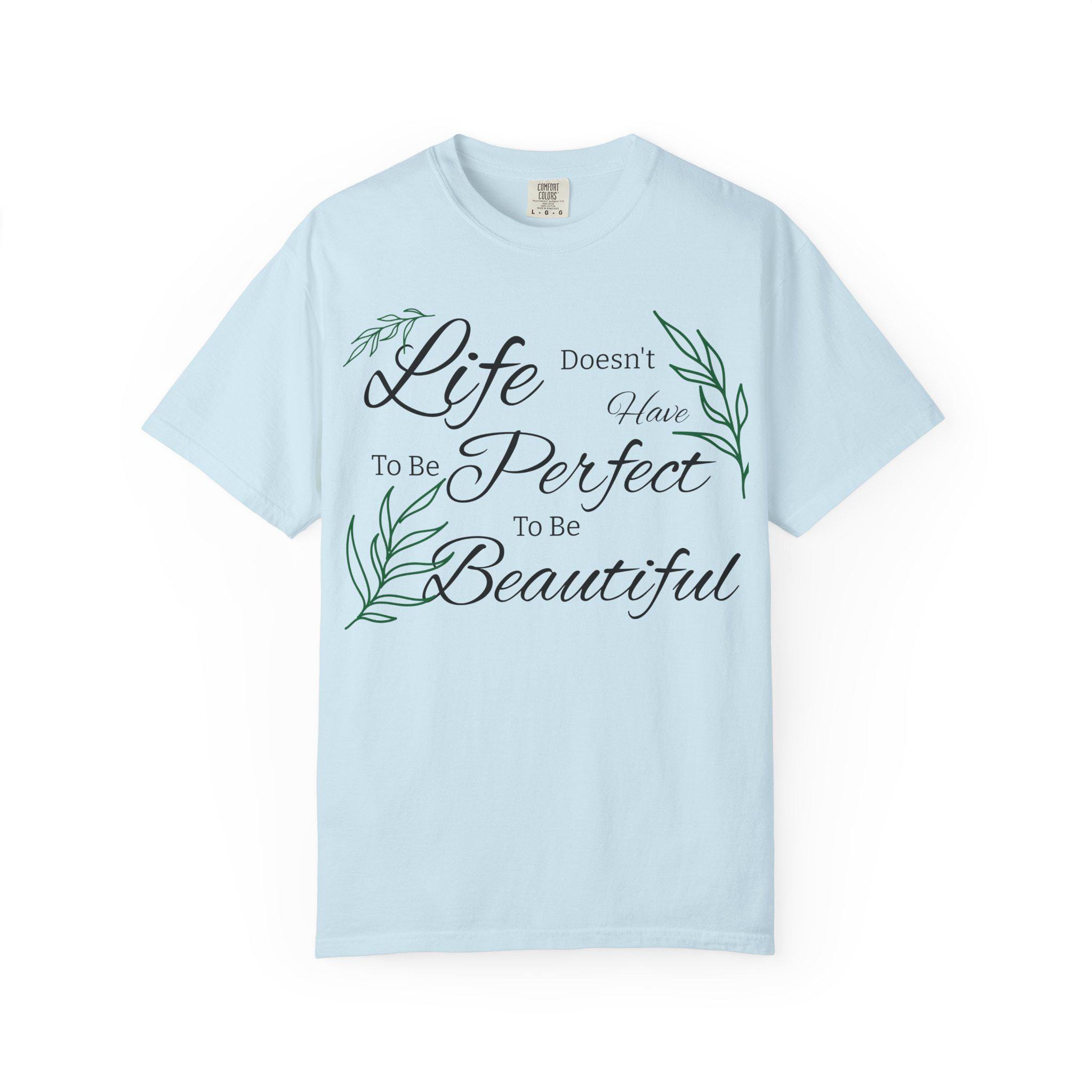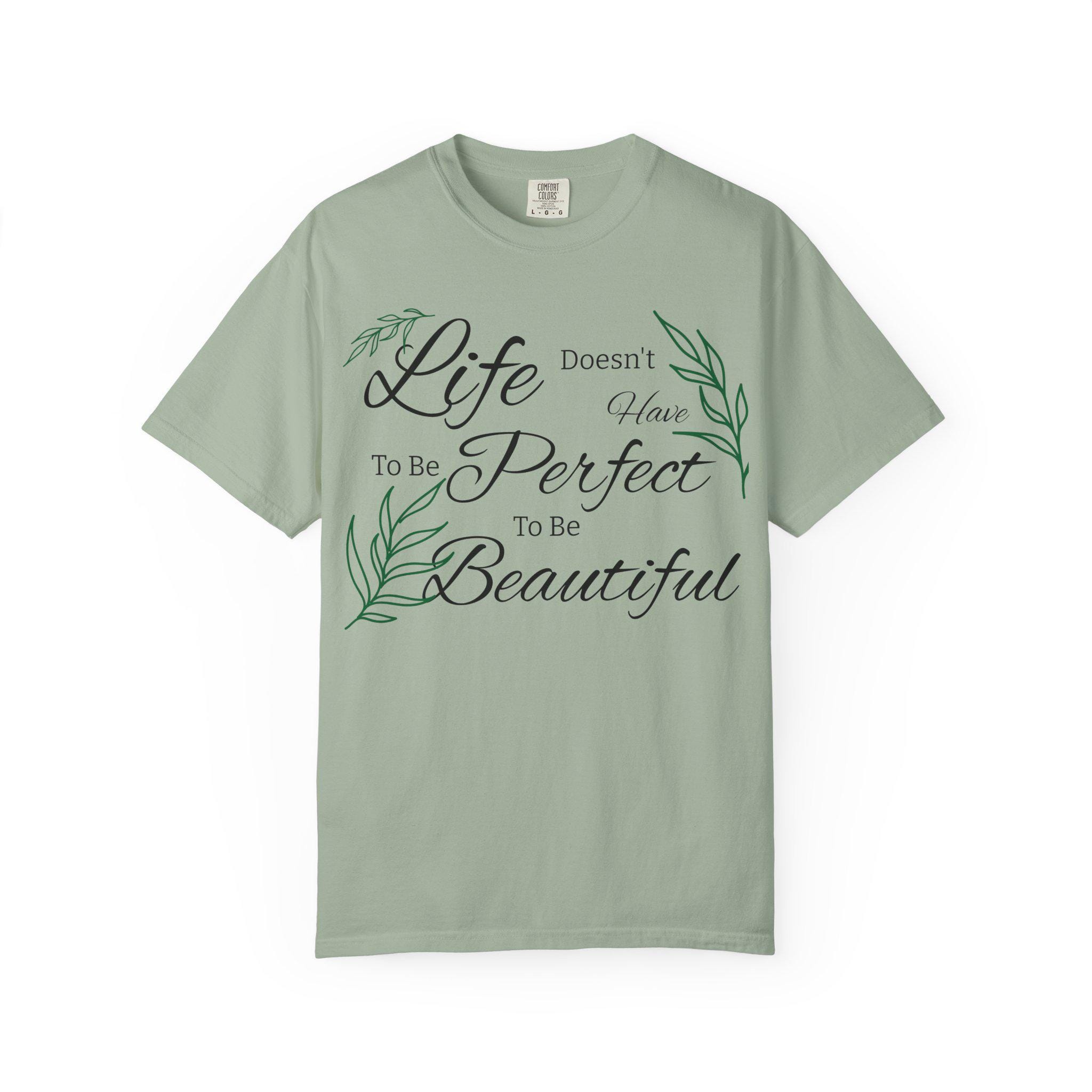 Soft, lived-in cotton meets quiet encouragement. This relaxed-fit tee wears like an old favorite the moment you pull it on — the garment-dyed finish gives a gentle, muted color and a pillowy hand while the script and delicate leaf illustrations whisper a simple message: life doesn’t have to be perfect to be beautiful. It’s the kind of shirt you reach for on slow mornings, for backyard coffee, or to layer under a cardigan at a casual gathering. Durable double-needle stitching and a heavyweight knit mean it holds its shape and stays comfortable through repeated wear. Available in a wide range of tones and sizes, it blends into everyday routines and becomes part of the small rituals that brighten ordinary days.